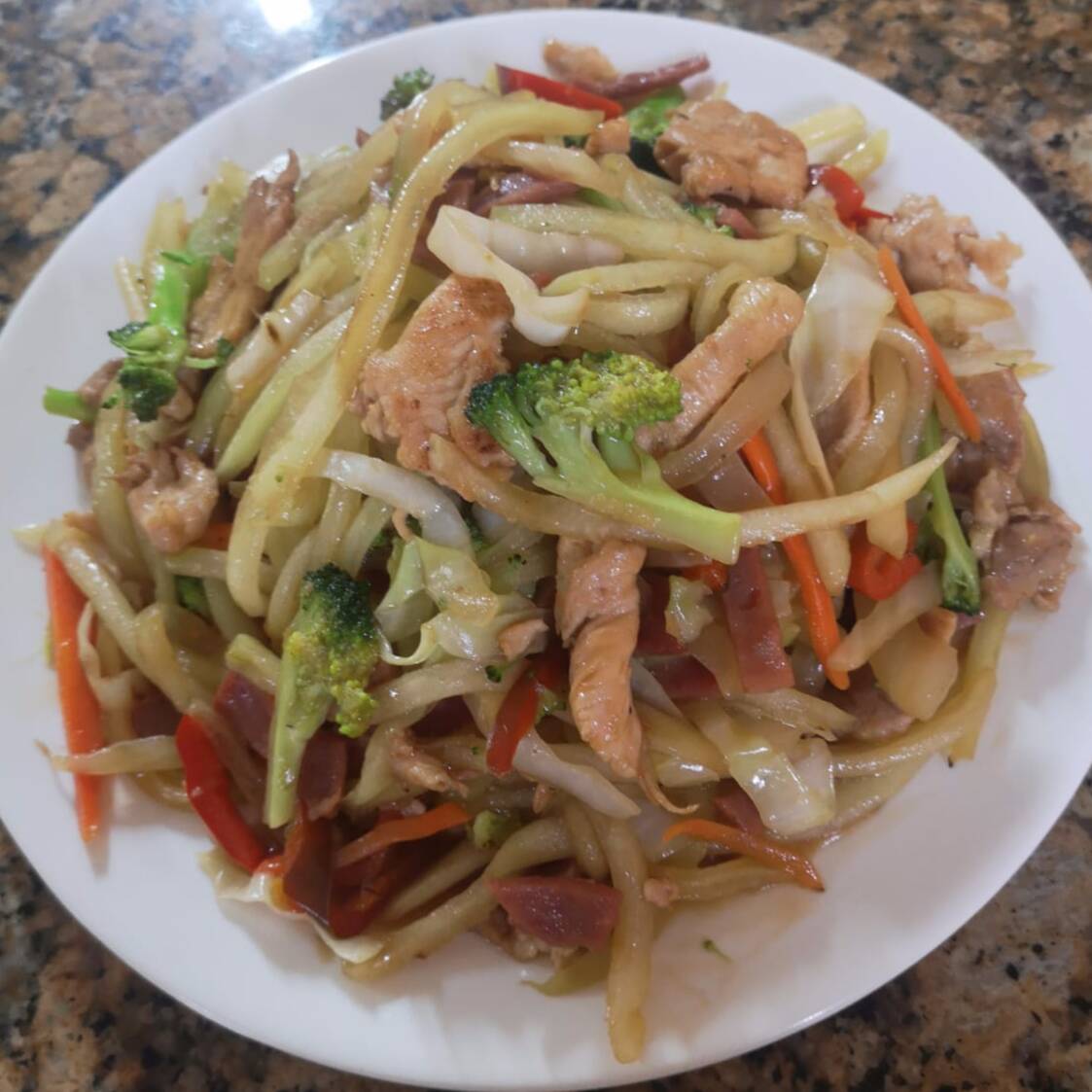 Vegetales salteados en salsa, con pollo, cerdo, jamon, perfecto para dos personas