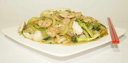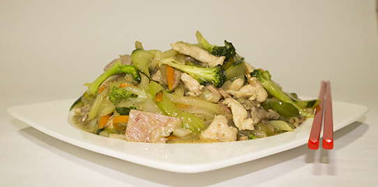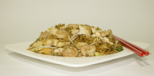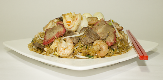 Arroz, verduras salteados con pollo, cerdo y jamón.