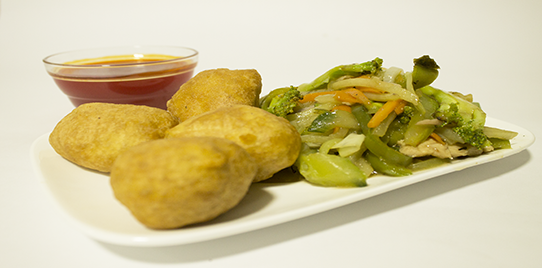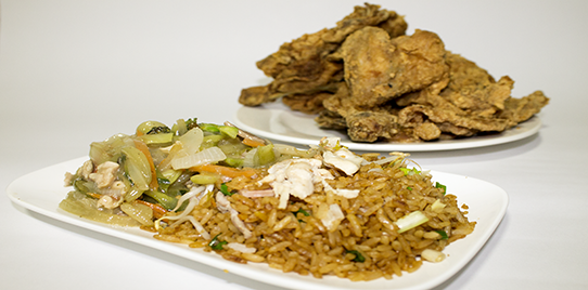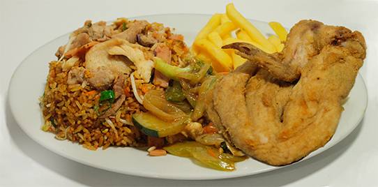 Arroz chino especial acompañado de chopsuey y un pollo apanado.