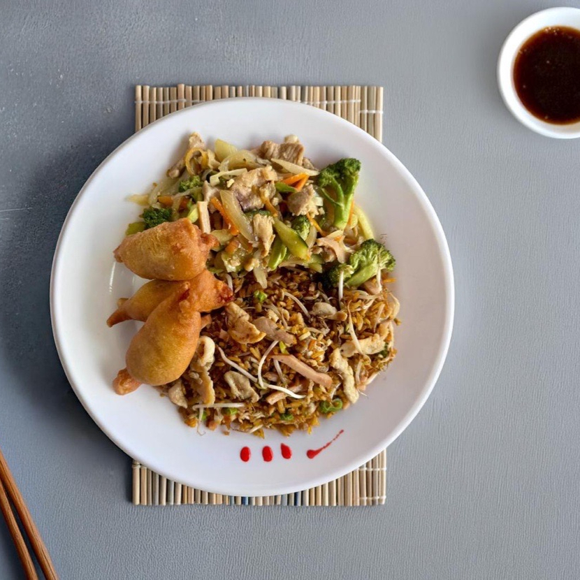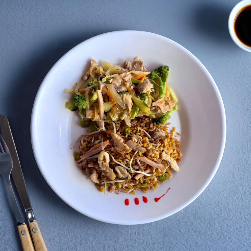 Arroz especial con pollo, cerdo y jamón + Chop suey, incluye salsa agridulce de la casa. Personal (1 porción), Pequeña (1-2 porciones), Mediana (3-4 porciones), Grande (5-6 porciones), Mega (8-10 porciones).
