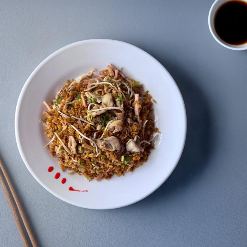 Arroz especial con pollo, cerdo y jamón, incluye salsa agridulce de la casa. Personal (1 porción) Pequeña (1-2 porciones), Mediana (3-4 porciones), Grande (5-6 porciones), Mega (8-10 porciones).