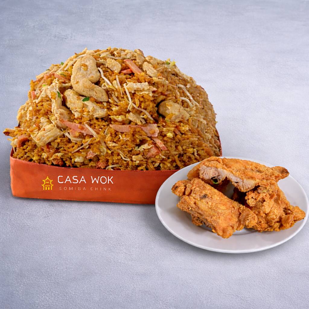 Arroz especial con pollo, cerdo, jamón, incluye salsa agridulce de la casa + 2 presas de pollo apanado. Personal (1 porción), Pequeña (1-2 porciones), Mediana (3-4 porciones), Grande (5-6 porciones), Mega y Super Mega (8-10 porciones).