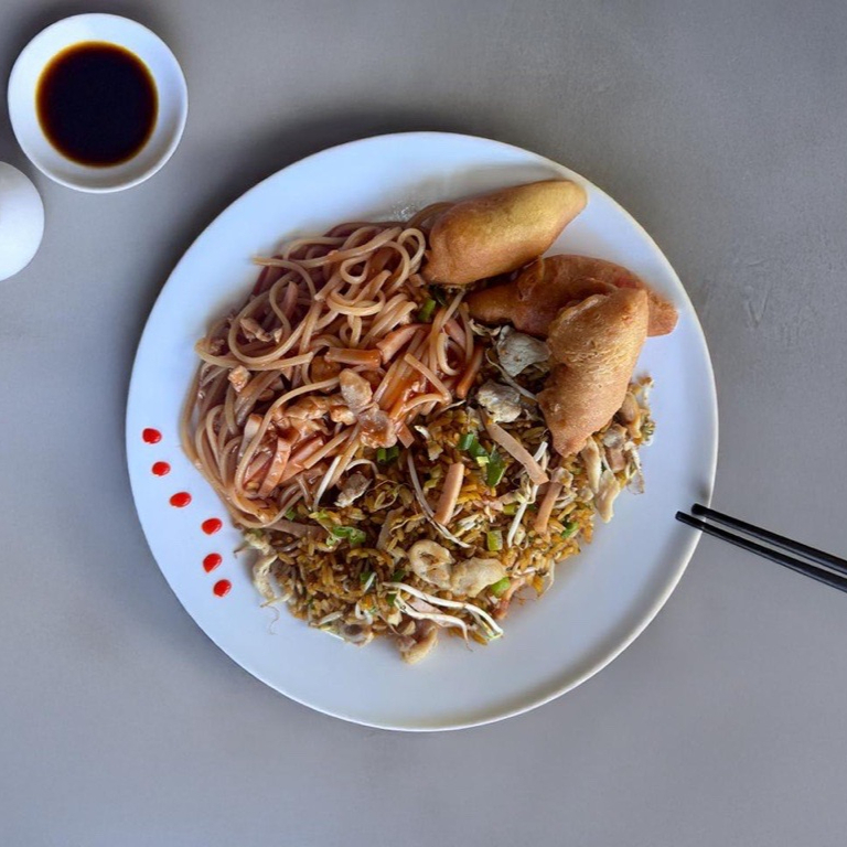 Arroz especial con pollo, cerdo, jamón + croquetas de pollo agridulce + Espaguetis, incluye salsa de la casa. Persona (1 porción), Pequeña (1-2 porciones), Mediana (3-4 porciones), Grande (5-6 porciones), Mega (8-10 porciones).