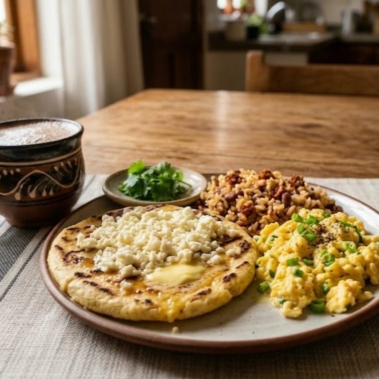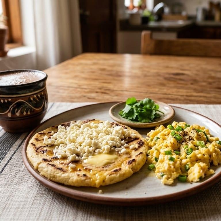 Arepa con mantequilla, quesito, huevo revuelto, chocolate