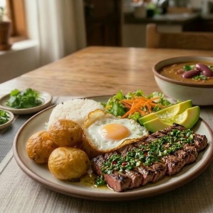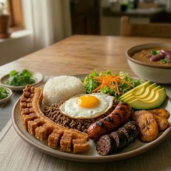 Bandeja Paisa con Chicharron, huevo frito, morcilla, chorizo, carne moloida jugo o guandolo