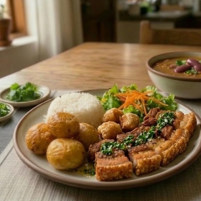 Sopa, arroz, ensalada, proteína y acompañante, jugo o guandolo
