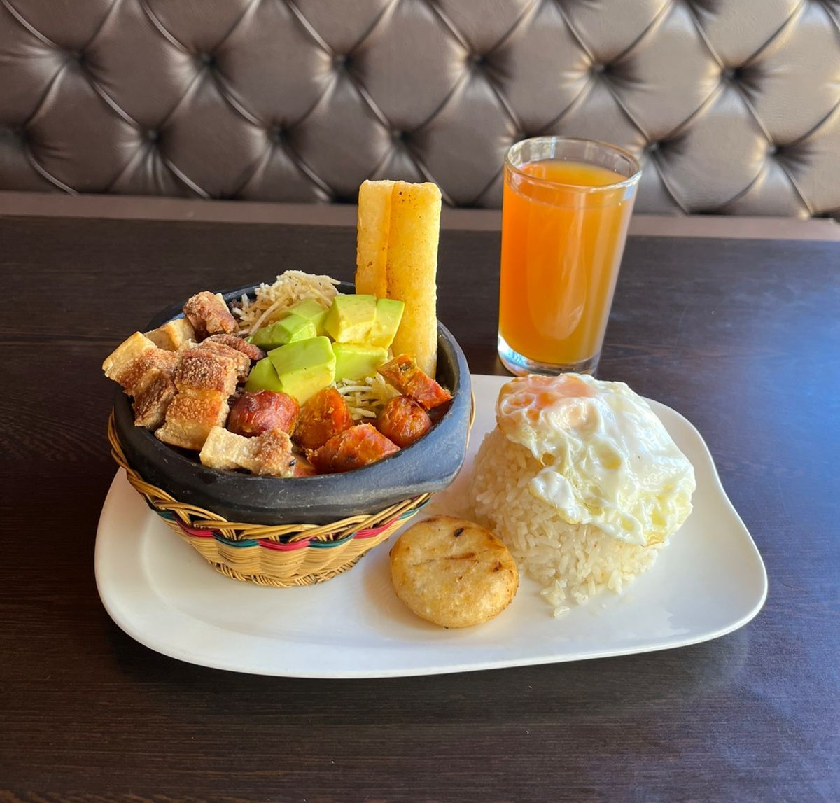 Cazuela del pueblo con arroz, frijoles, Chicharrón, chorizo, huevo frito, aguacate, croqueta de yuca, ripio de papa arroz, arepa frita, acompañado de jugo del dia
