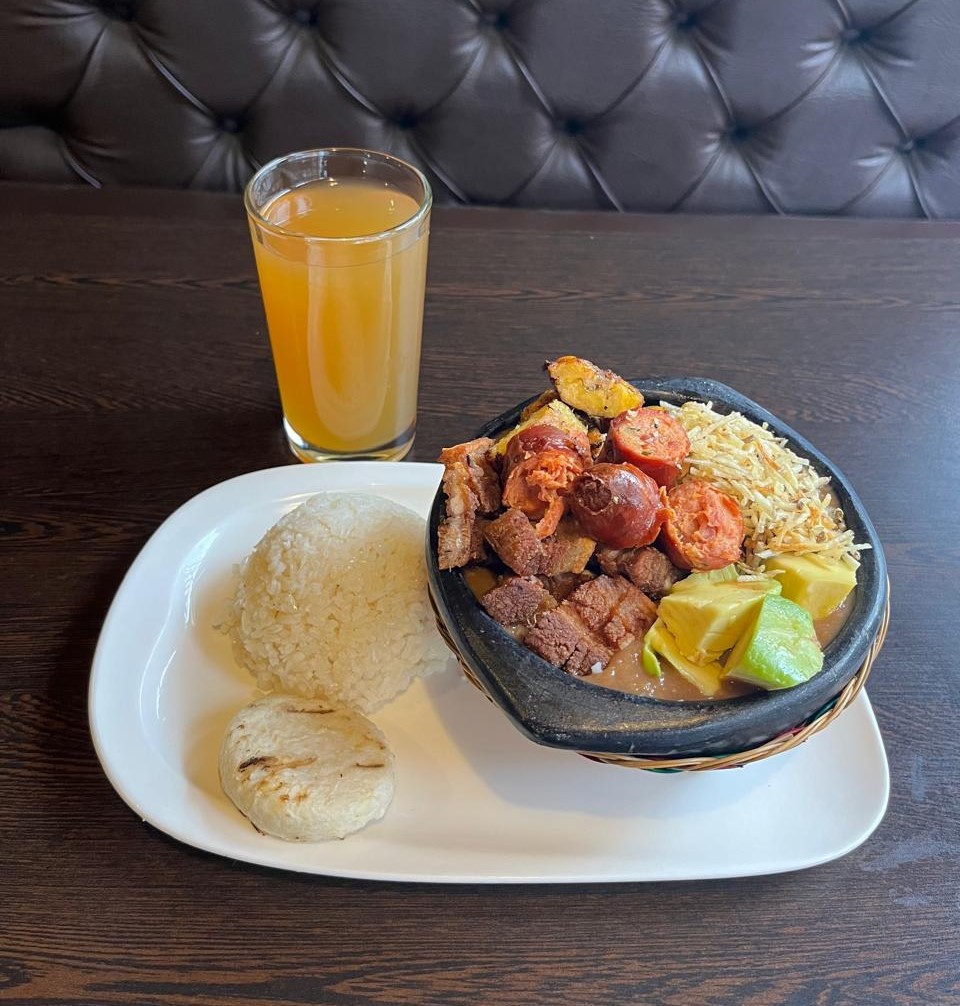 Cazuela caserita con arroz, frijoles, chicharron, chorizo, aguacate picado, maduro frito picado, ripio de papa, arepa frita, acompañado de jugo del dia