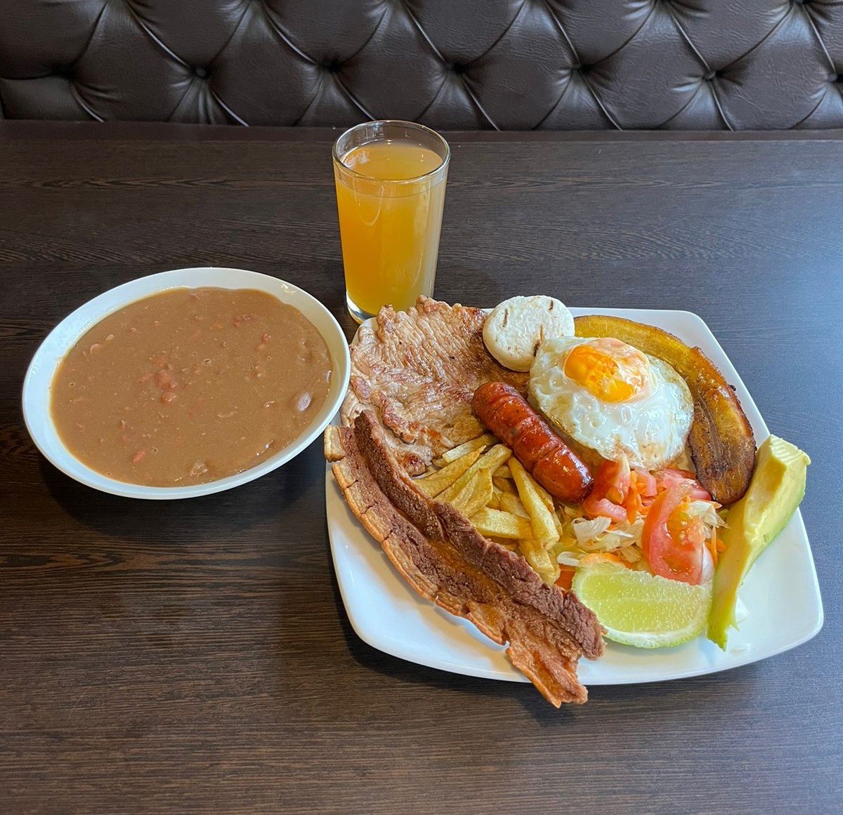 Tipico completo con arroz blanco, carne de cerdo a la plancha, papas a la francesas, huevo, chorizo, ensalada de la casa, tajada de maduro y arepa, acompañado de plato de frijol y guarapo.