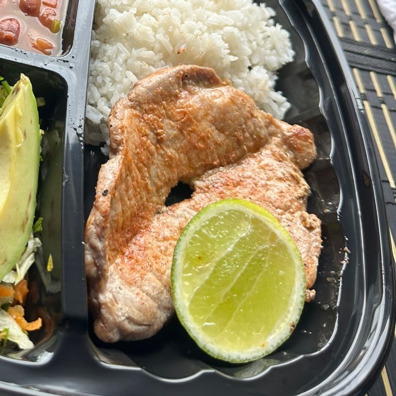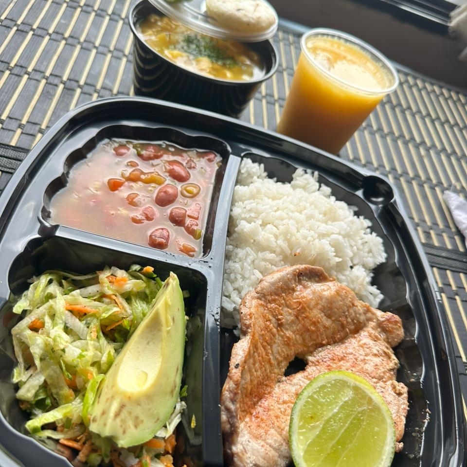 Bandeja con 120gr de cerdo pulpa acompañada de arroz blanco, patacón de maduro, ensalada, aguacate, frijol en bandeja, sopa del día, arepa, limón y jugo del día