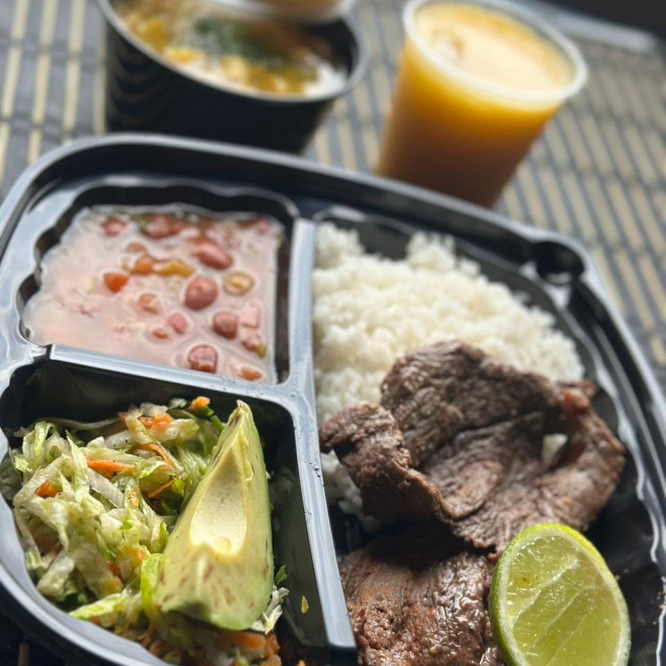 Bandeja con 120gr de res pulpa acompañada de arroz blanco, patacón de maduro, ensalada, aguacate, frijol en bandeja, sopa del día, arepa, limón y jugo del día