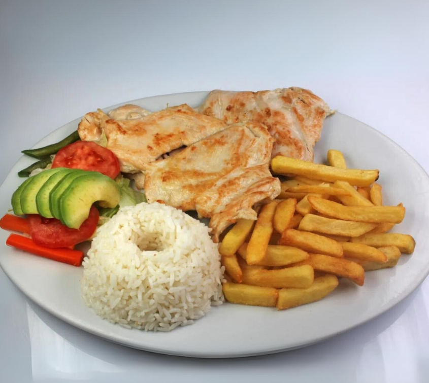 Porción de pollo a 230 g acompañado de arroz ensalada y papa al vapor o papa frita.