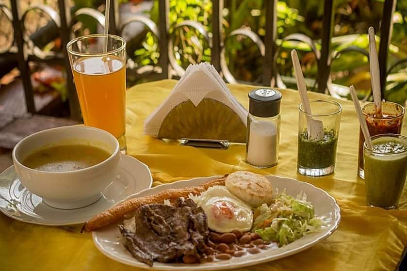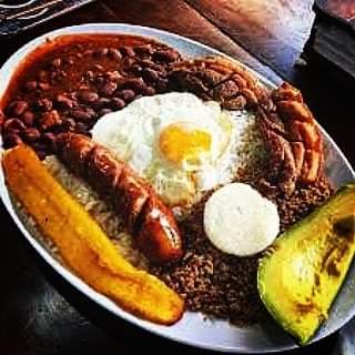 Frijol, arroz, maduro, huevo, ensalada, aguacate, arepa, chicharrón, molida y chorizo de cerdo.