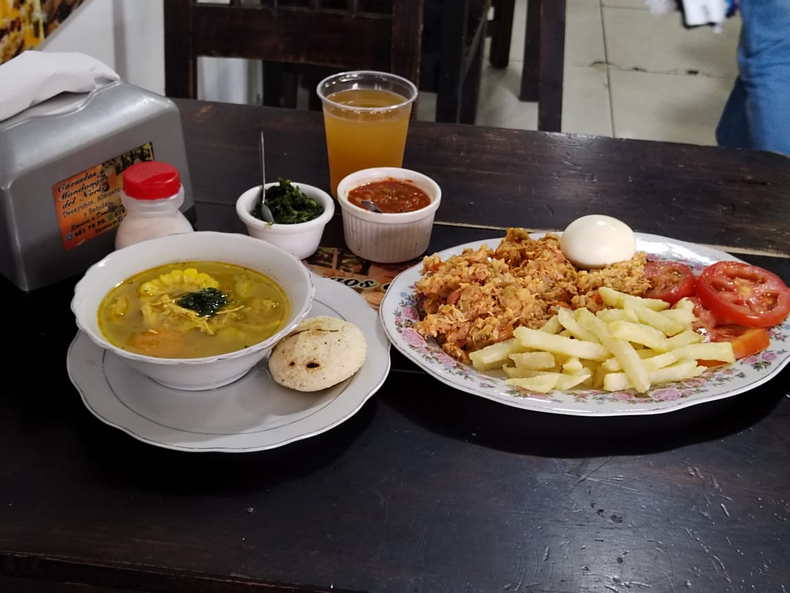 Sopa del día, arroz, maduro, huevo, ensalada, arepa, carne de (res, cerdo, pollo, chicharrón, molida o chorizo)., mas bebida