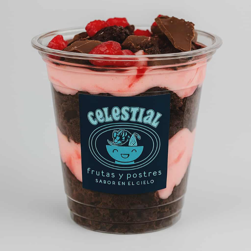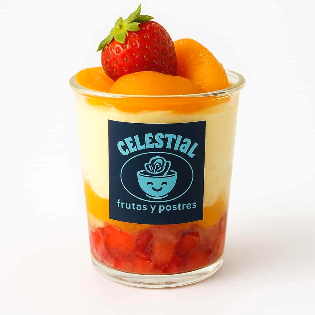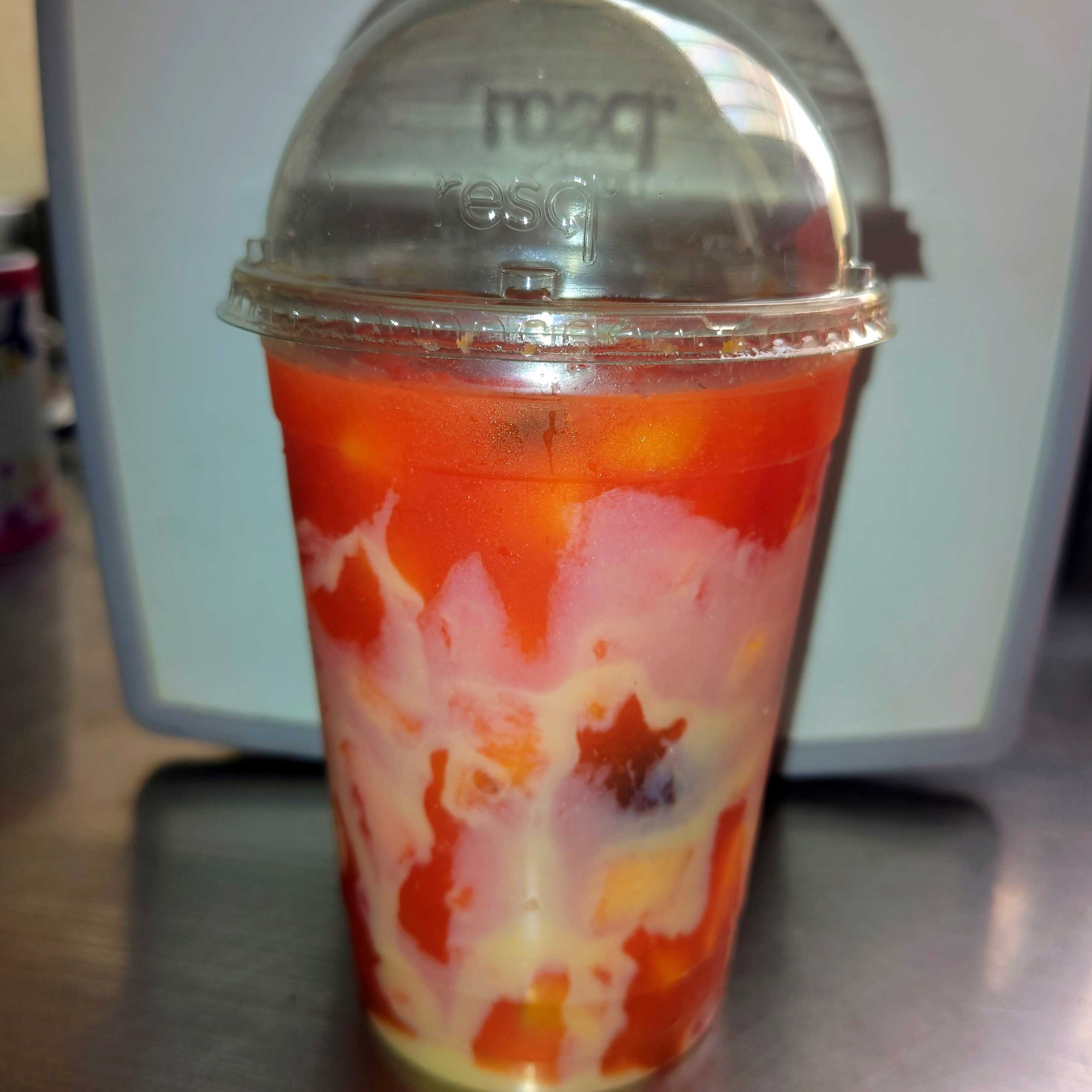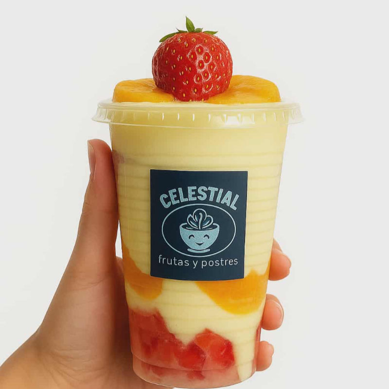 Mix de frutas tropicales picadas en jugo natural con leche y azúcar, presentación individual.