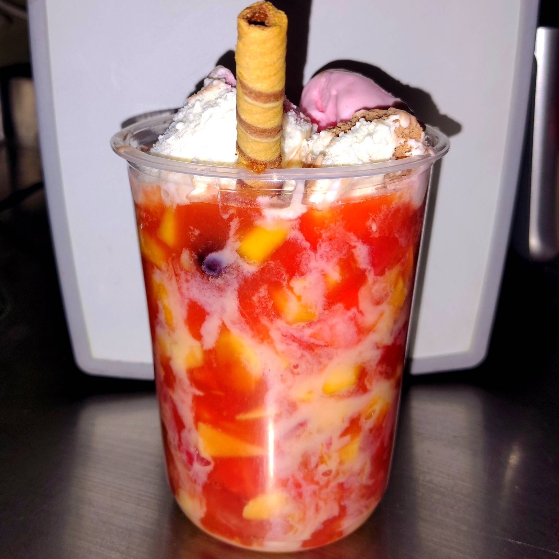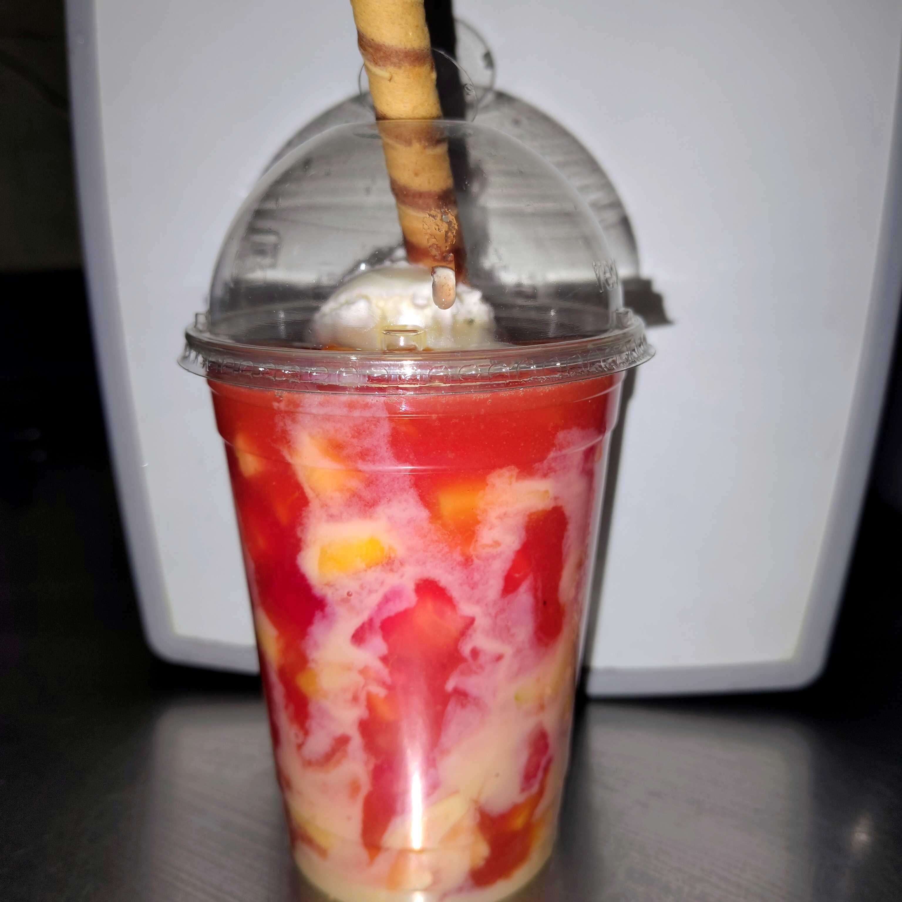 Mix de frutas tropicales picadas en jugo natural con leche, acompañado de una bola de helado, presentación individual.