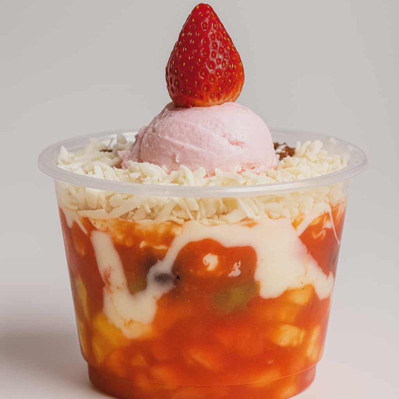 Mix de frutas tropicales picadas en jugo natural con leche condensada, queso rallado y una bolsa de helado