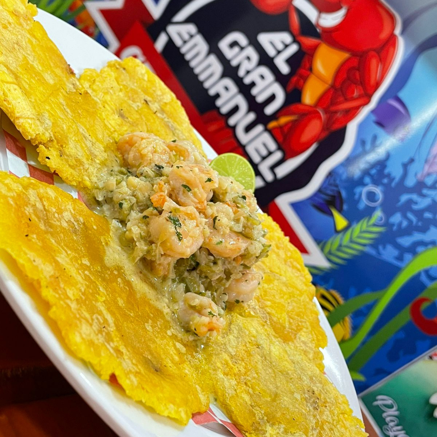 patacones, aguacate, mariscos a elegir ( camaron o mixtura de mariscos)
