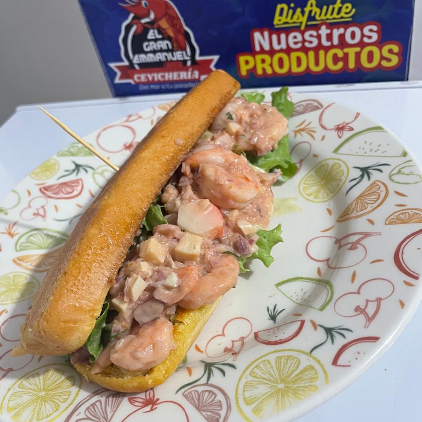 pan artesanal, lechuga, queso, salsa de la casa, mariscos a elegir camaron o mixtura de mariscos.