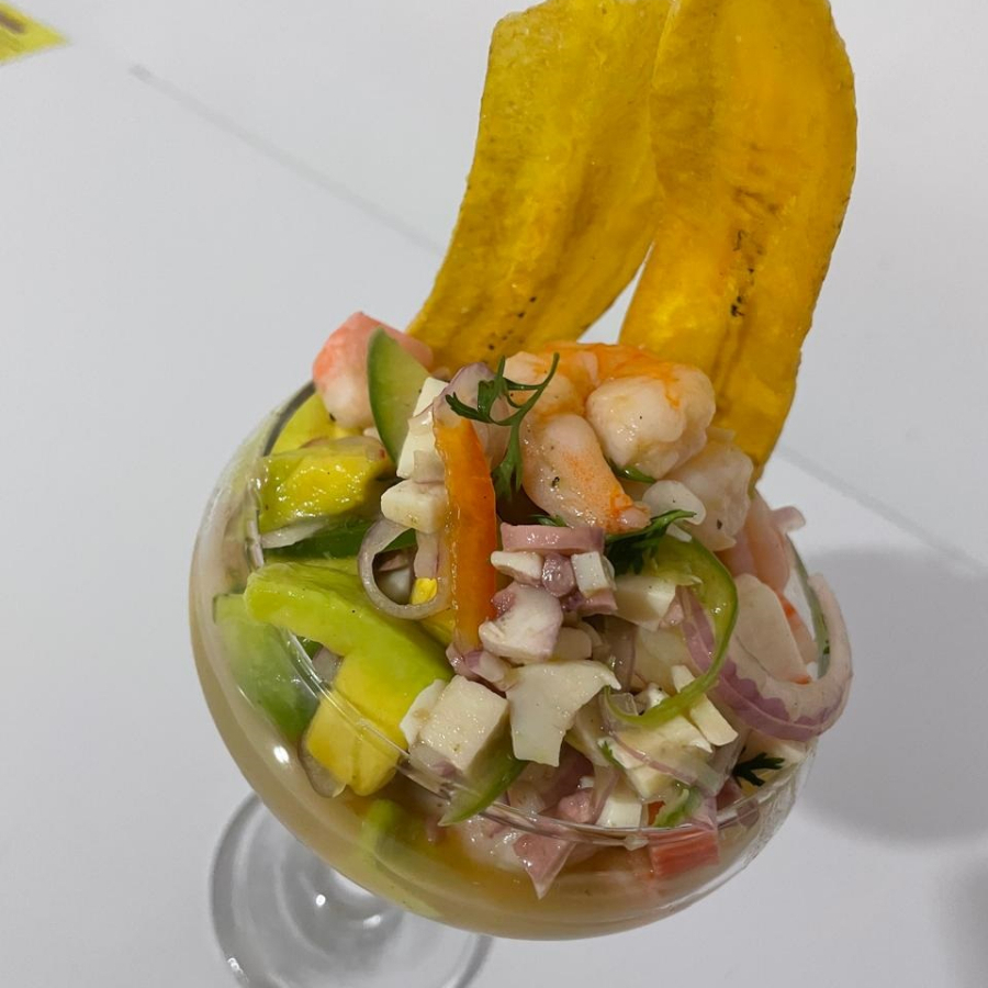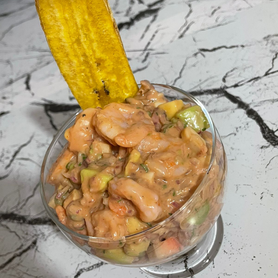 camaron o mixtura de mariscos. Aceite de oliva, jugo de limon, vinagreta de la casa, cebolla en juliana, pimenton, eliges (mango o aguacate) jalapeño opcional