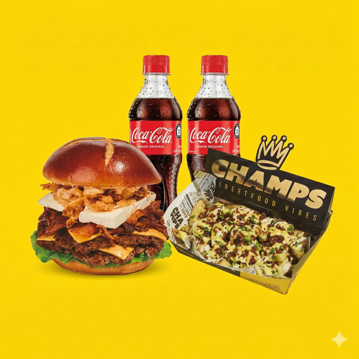 Elige 1 burger entre bacon cheeseburger, philadelphia burger o burger trufada y elige 1 fries entre papas mexicanas, papas american all stars o salchipapas champy más dos gaseosas 400 ml.