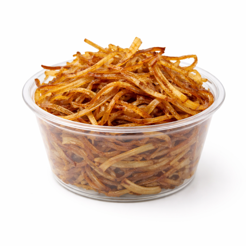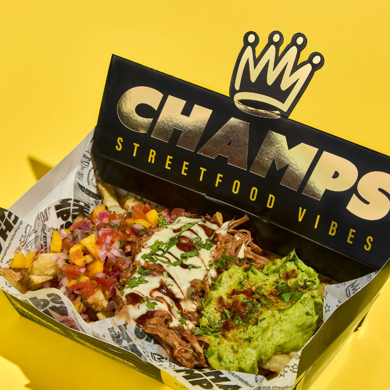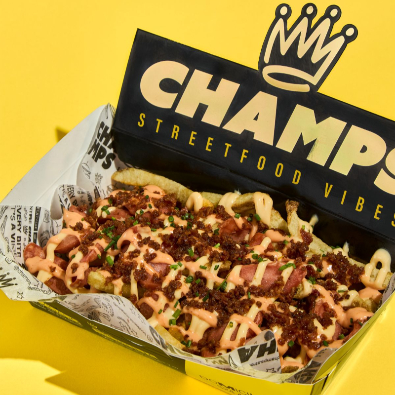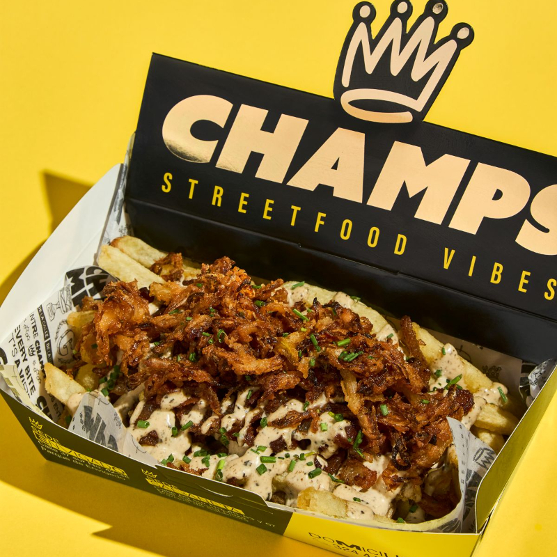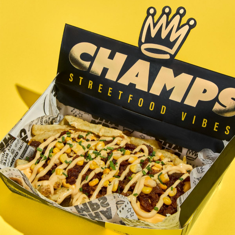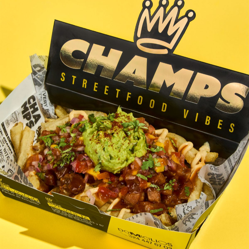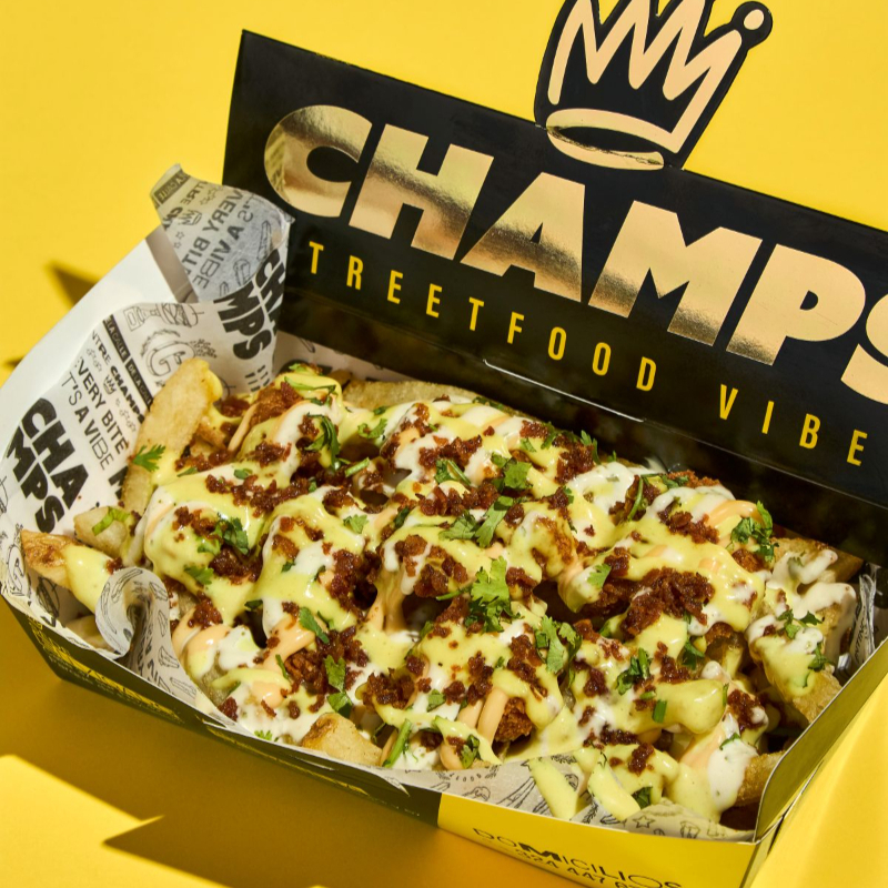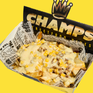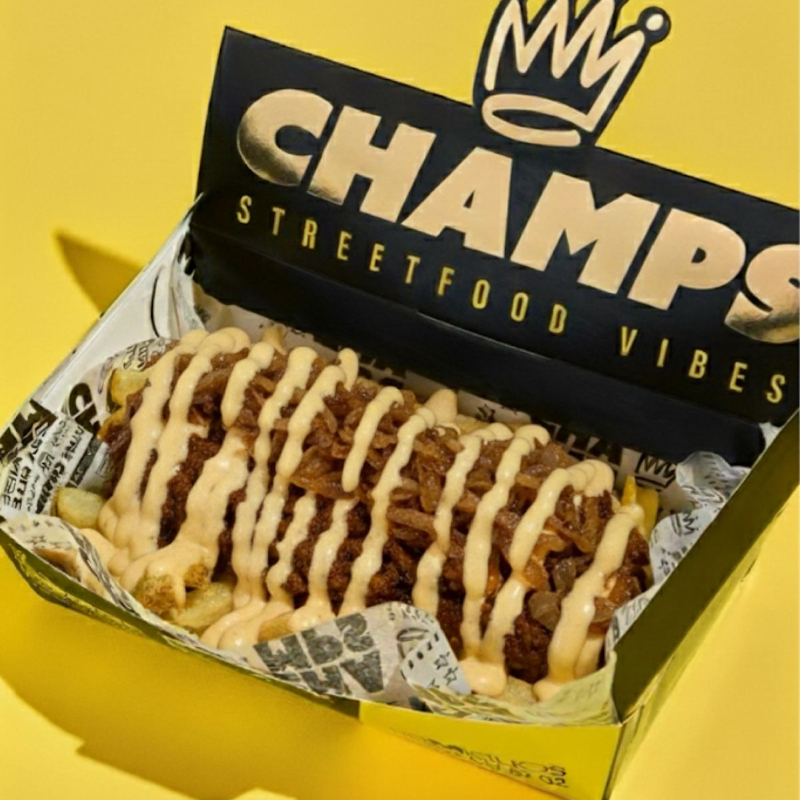 Papas artesanales bañadas en salsa queso cheddar, salsa champs, con 150 g de carne smash picada y coronada con cebolla caramelizada.