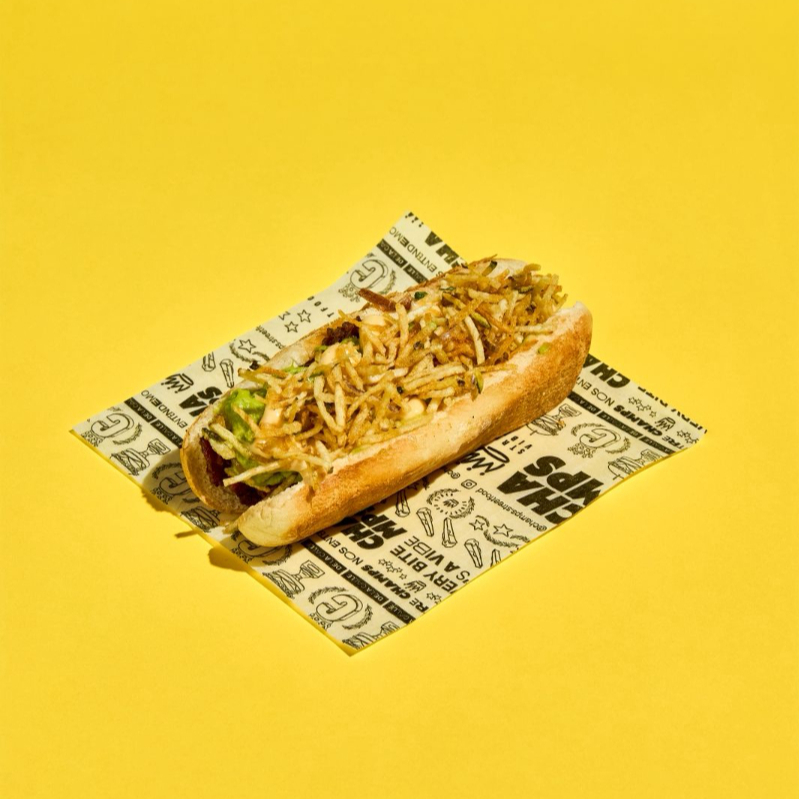 Pan con salchicha, pico de gallo fresco, salsa Victoria y coronado con ripio de papá. Incluye una porción de papas.
