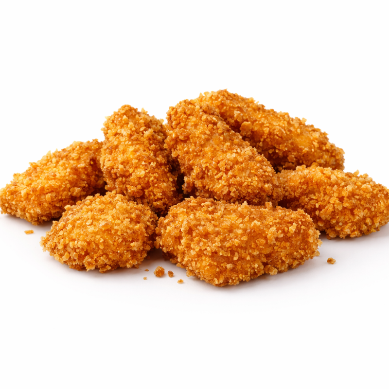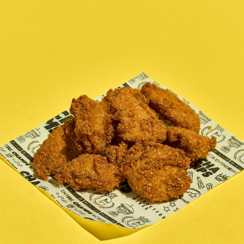 Trozos de pechuga apanados acompañados de papas crocantes con una salsa a elección: salsa golden, BBQ supreme o mayo sriracha. Incluyen una porción de papas.