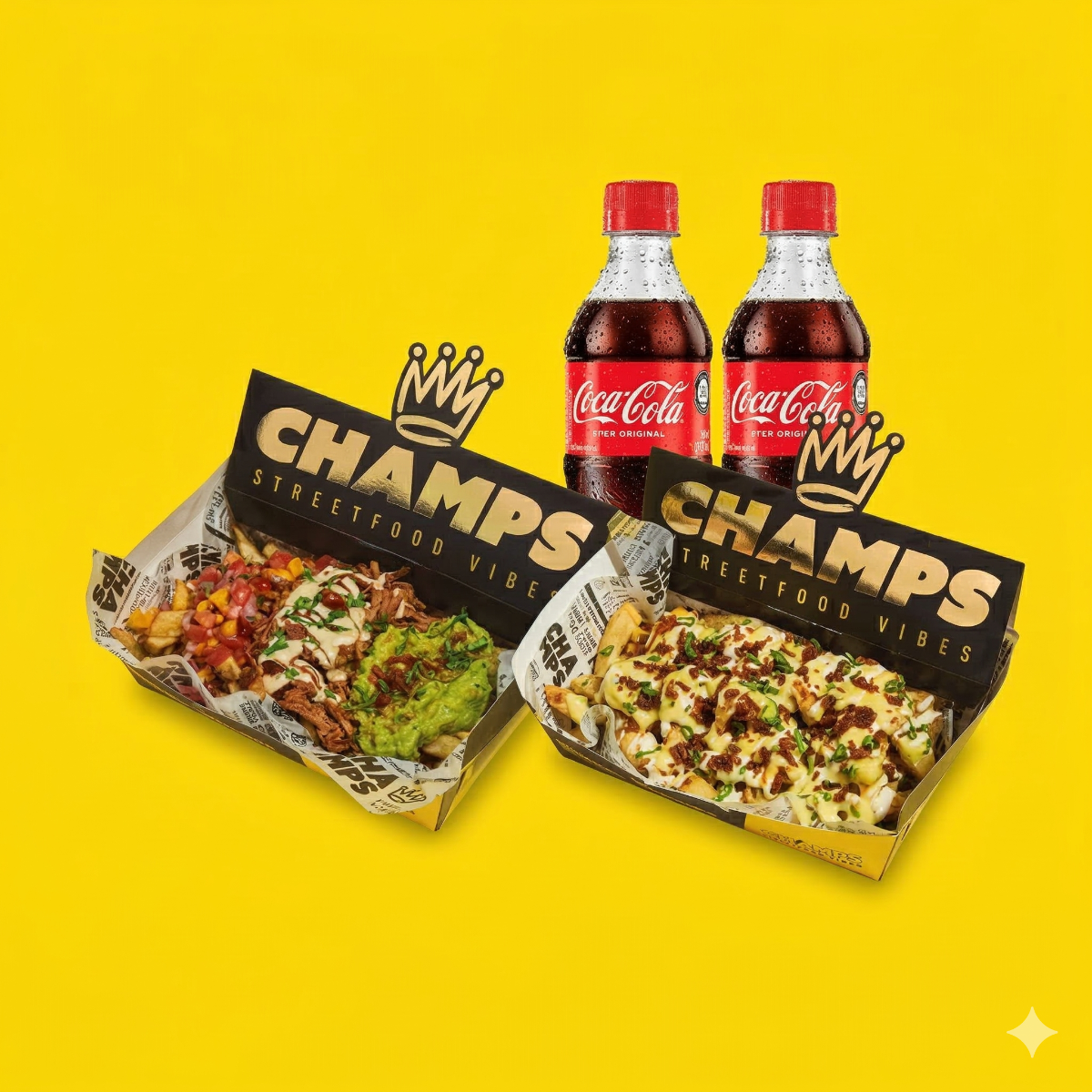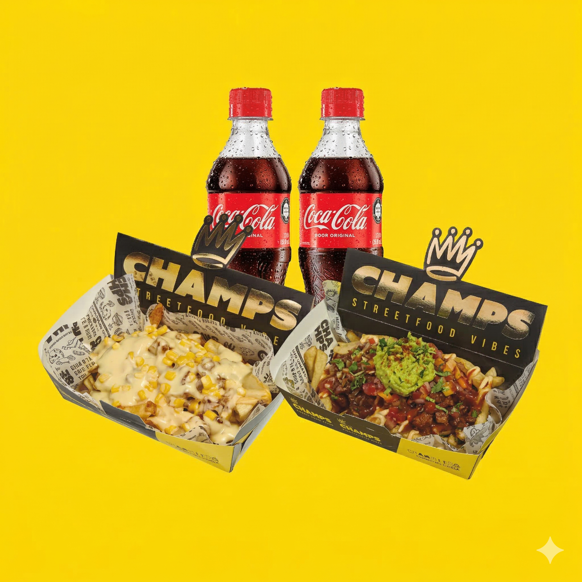 Elige 2 fries entre papas mexicanas, papas american all stars o salchipapas champy más dos gaseosas 400 ml.