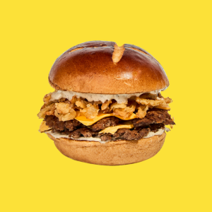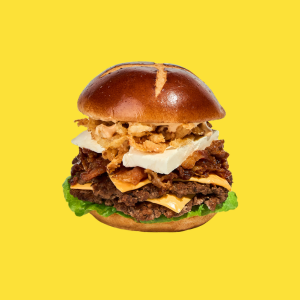 Pan pretzel artesanal, doble carne smash, con doble queso americano, tocineta crunch, cebolla caramelizada y salsa champs.