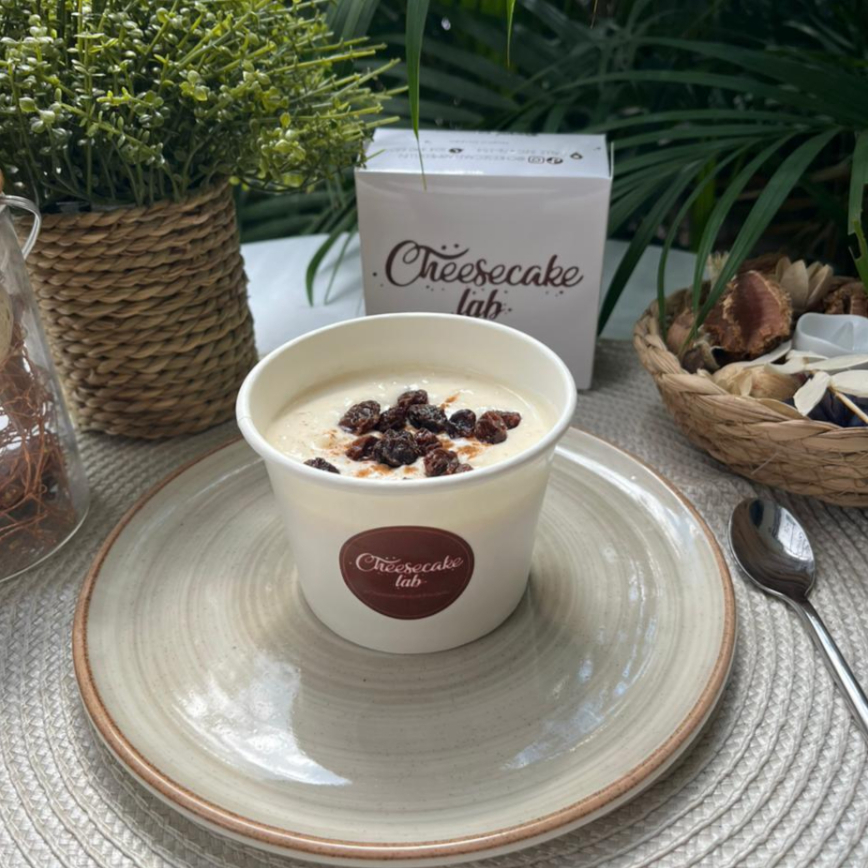 Exquisito y cremoso arroz con leche de 12 oz (220 g) con cobertura de uvas pasas, puedes añadirle los toppings que quieras.
