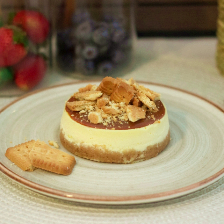 Cheesecake horneado 175 g con cobertura de arequipe y trozos de galleta de vainilla.
