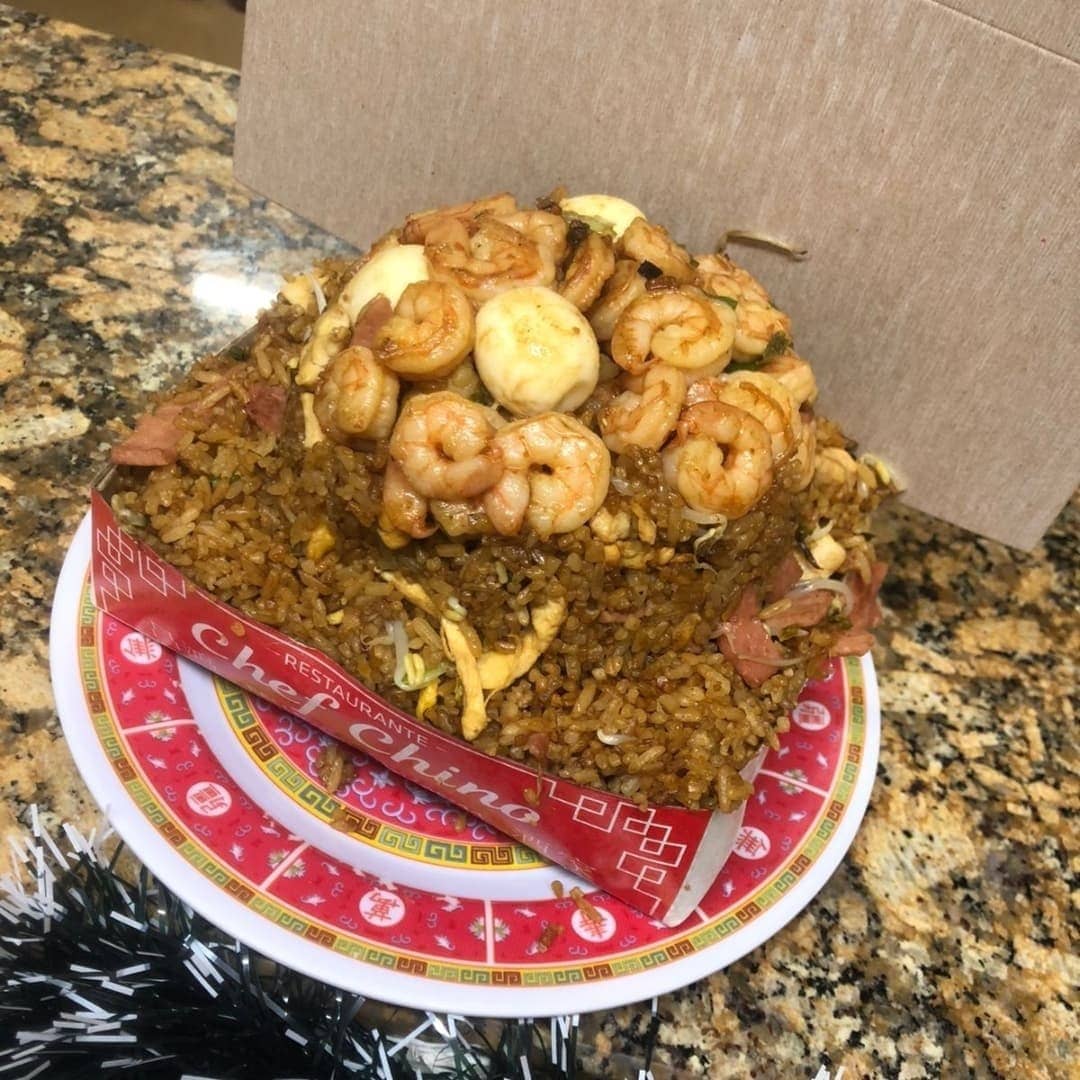 Arroz oriental grande con camarónes, cerdo salteado, jamón picado, trozos de pollo, raices chinas y vegentales salteados, acompañado de salsa agridulce, perfecto para 7/8 personas.
