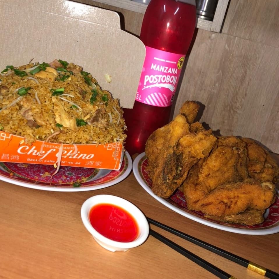 Combo de arroz chino especial grande, acompañado de pollo entero (8 presas de pollo apanadas) para maximo 6 personas.