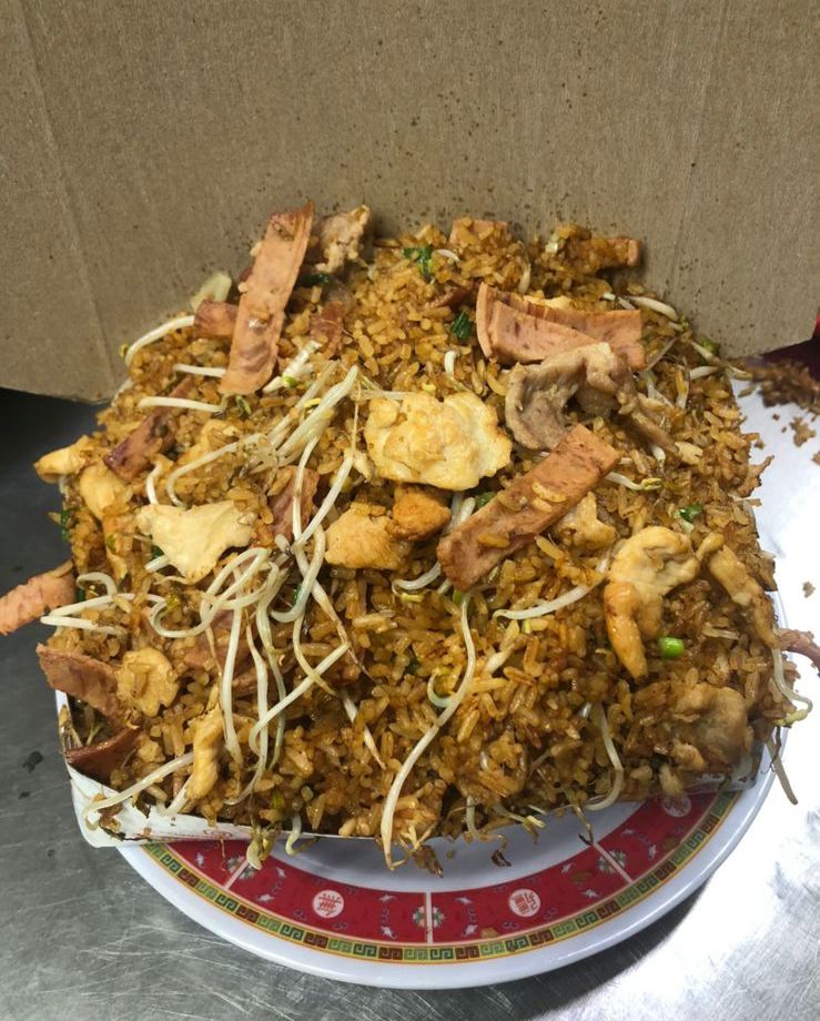 Arroz chino especial grande con cerdo salteado, pechuga de pollo en trozos, jamon picado, raices chinas y vegetales salteados, acompañado de salsa agridulce, perfecto para 7/8 personas