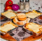 cuatro lasgnas de Pollo desmechado, carne molida, maicitos, queso mozzarella, Acompañado con pan de ajo.