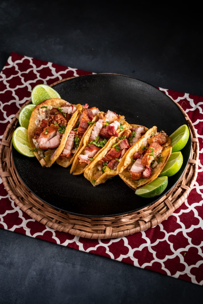 Cinco tortillas de maíz artesanal, chicharrón ahumado o bondiola, pico de gallo, salsas de la casa y limon.