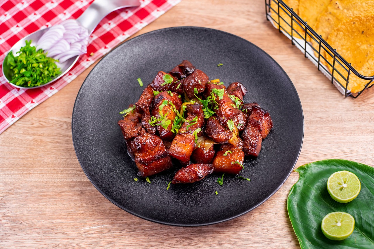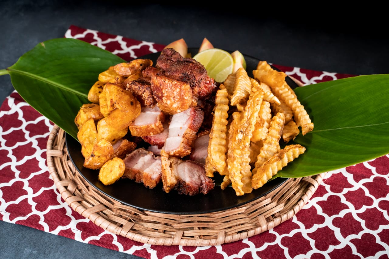 500 g de chicharrón ahumado al barril, acompañado de 2 guarniciones a elección, cascos de tomate, limón y salsas de la casa.