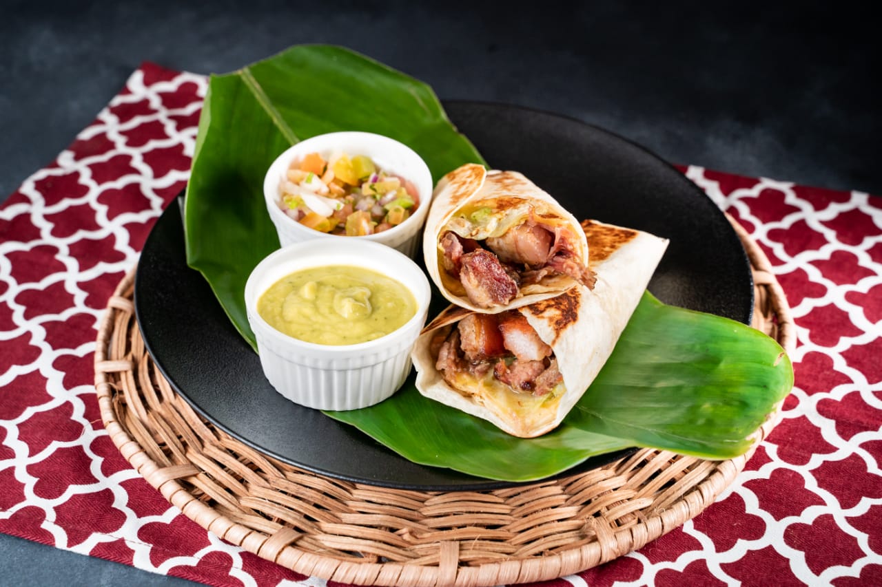 2 Tortillas de harina rellenas de bondiola o chicharron, quesos, lechuga y salsas de la casa.