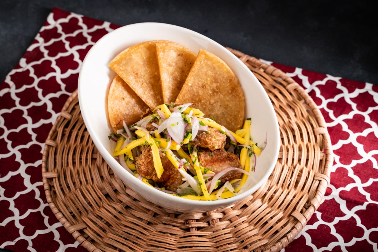 Chicharrón al barril, acompañado de un exquisito ceviche de mango, cebolla roja, cilantro y limón.