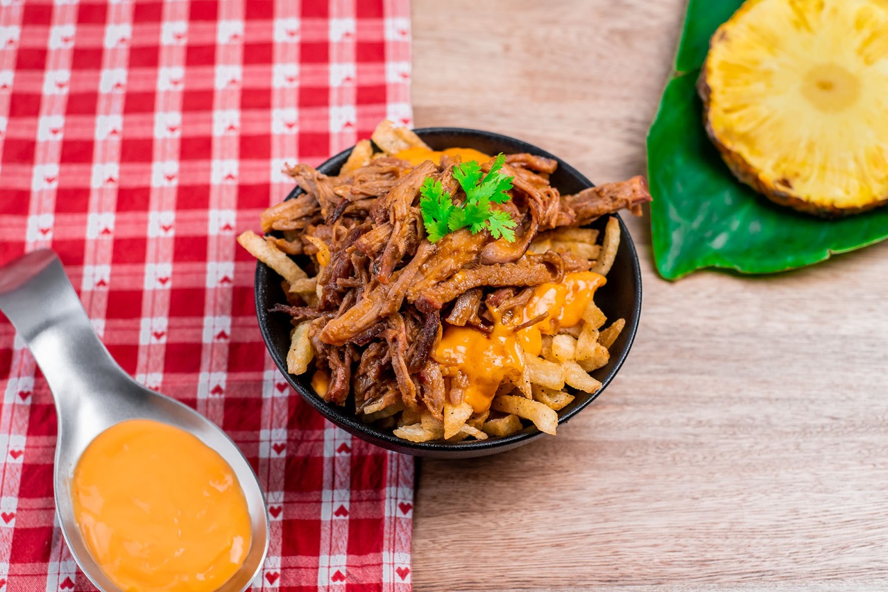 Papas fritas acompañados con bondiola al barril en cubos, maíz, tocineta y salsas de la casa.
