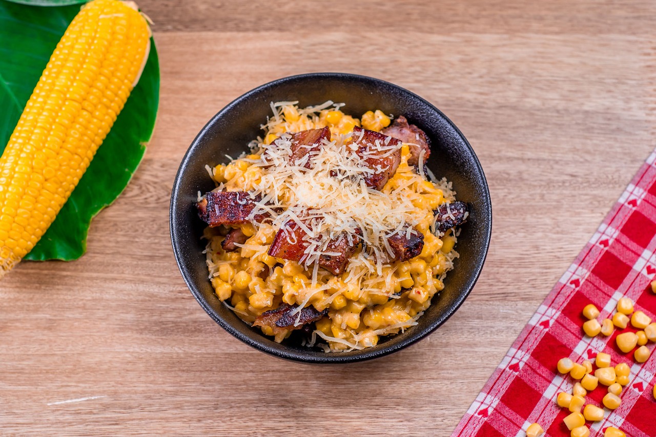 Maicitos bañados en salsa de la casa, queso parmesano, queso mozzarella, acompañado de chicharrón o bondiola.