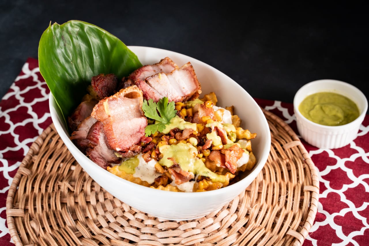 Papas fritas con chicharrón al barril, maicitos, tocineta y salsas de la casa.