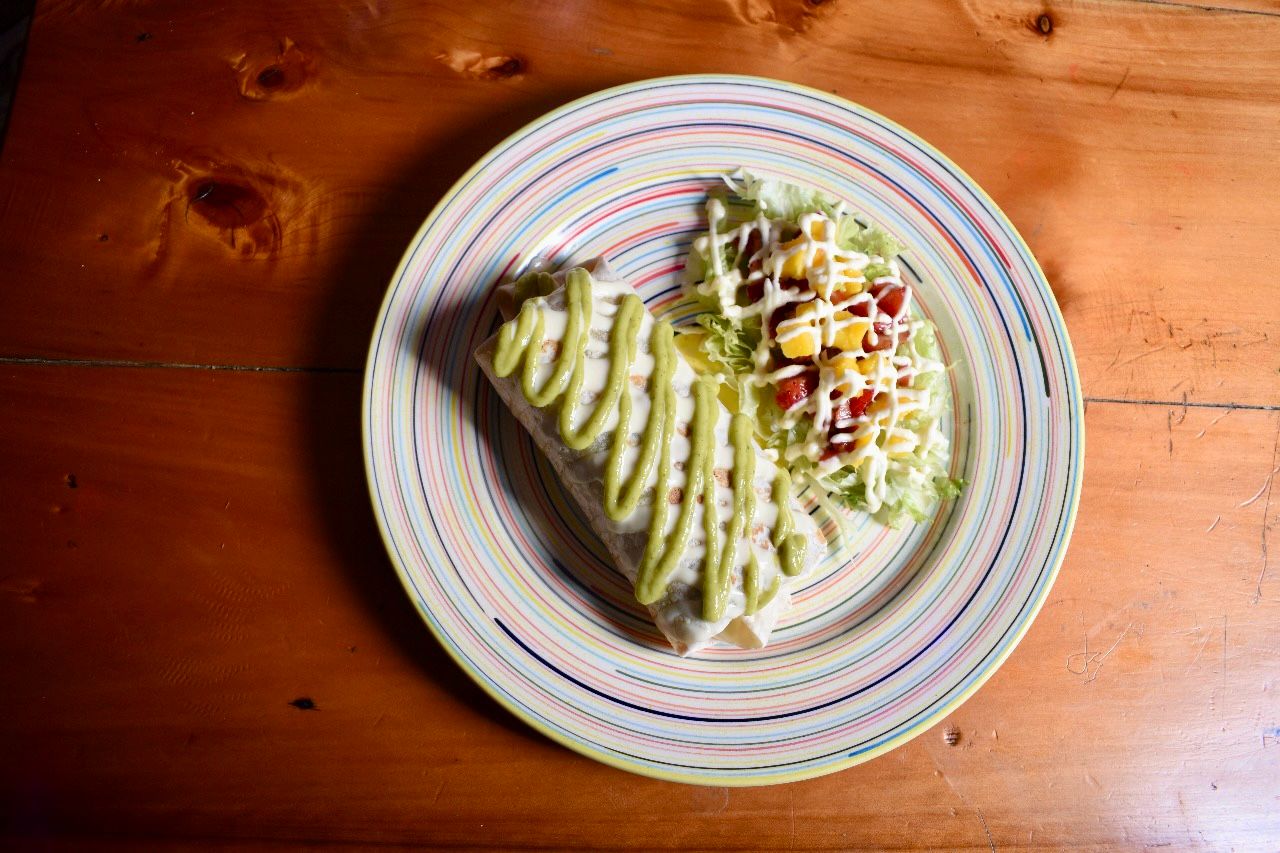 Preparada con salsa de frijoles, queso mozarella, sour cream, guacamole y mix de lechugas, envuelto en una tortilla de harina de trigo que se fríe en aceite vegetal, el plato va acompañado con ensalada de la casa.