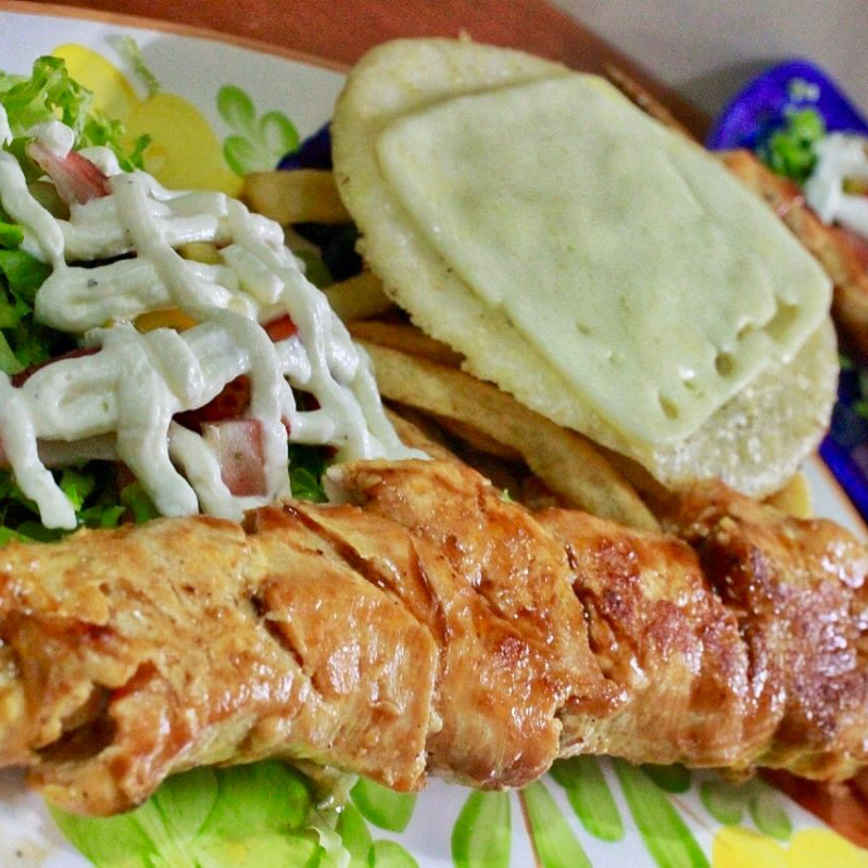 Chuzo de pollo acompañado de papas francesas, arepa con mozzarella.