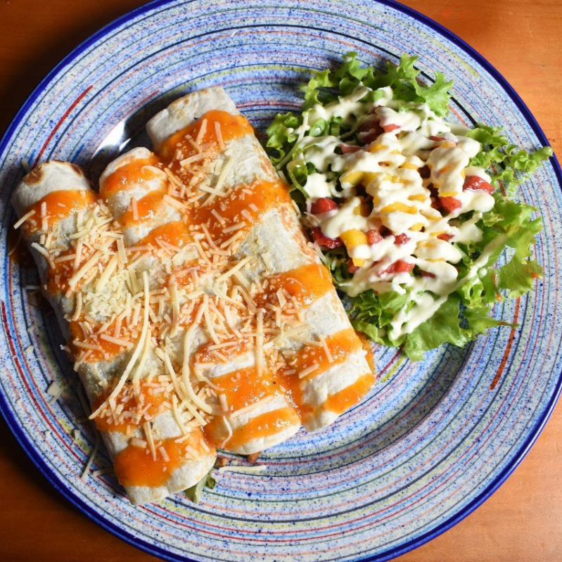 Preparado en salsa chipotle juntos a bechamel, relleno con salsa de frijoles, queso mozarella, sour cream, guacamole, mix de lechugas, envueltos en una tortilla de harina de trigo asada, acompañado con ensalada de la casa.