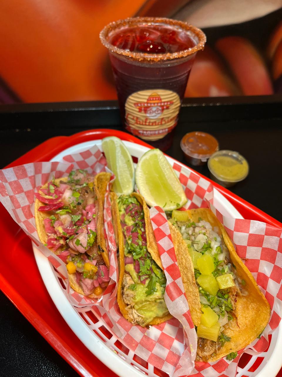 3 tacos de pollo, cerdo y chicharron, acompañado de una bebida a eleccion