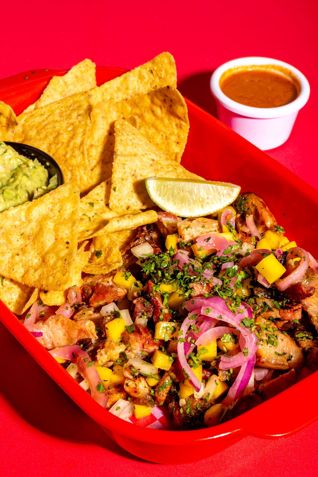 Ceviche de chicharron, acompañado de cebollar roja encurtida, mango, cilantro, limon y especies de la casa, guacamole y nachos.