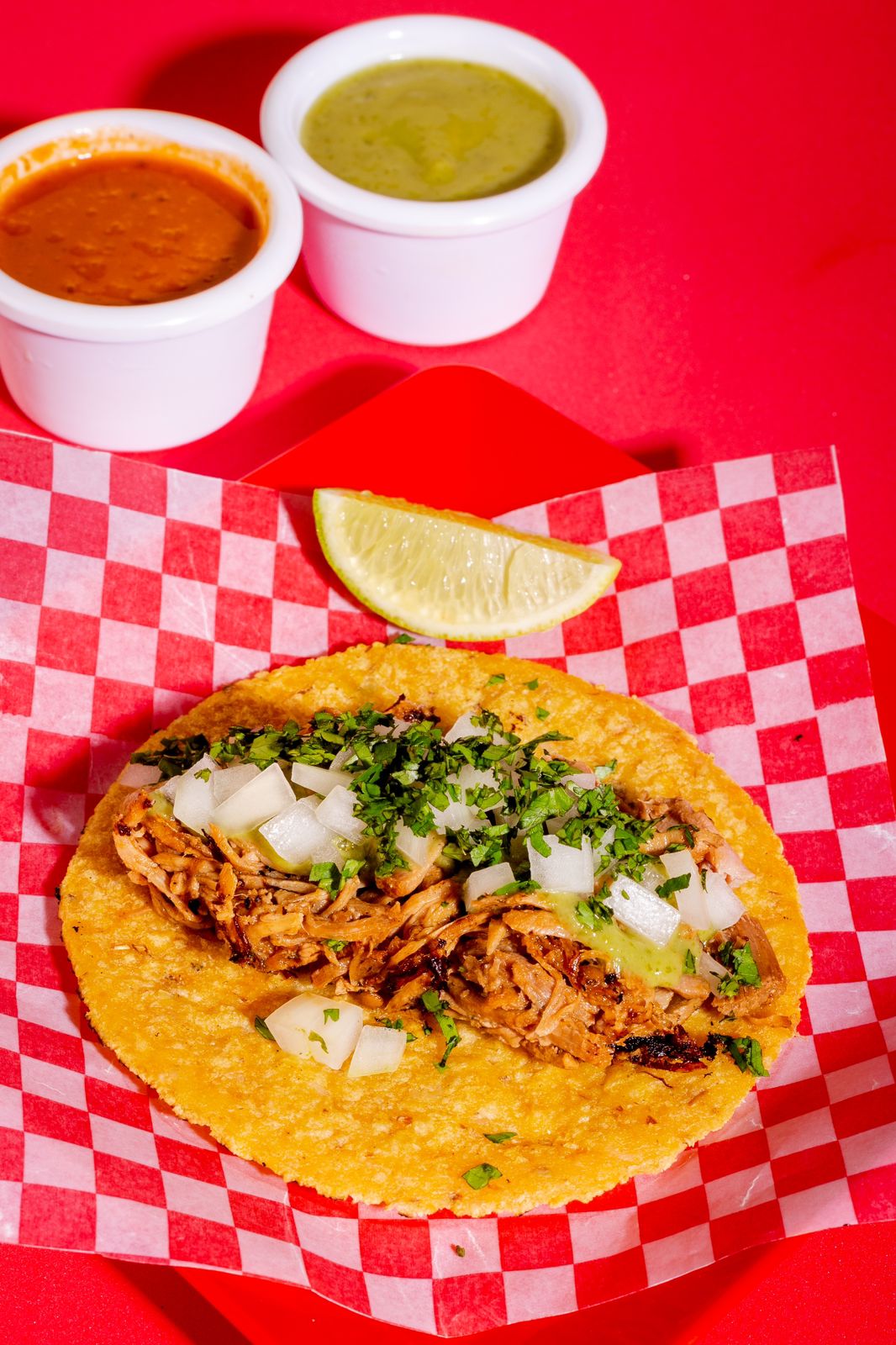 Taco de cerdo desmechado, piña, cebolla, cilantro, elegir salsa de la casa.