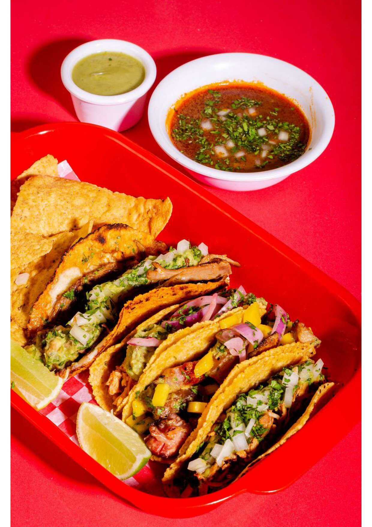 1 Taco chilindrina, 2 tacos a elegir, salsa taqueta de la casa y limon.